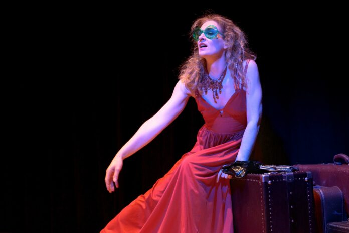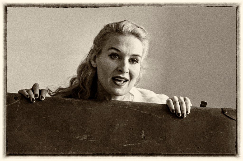 Une valise posée sur un petit plateau. Une valise qui a voyagé. Et soudain, comme s’en extirpant, une longue femme blonde en robe rouge, étole de fourrure blanche sur les épaules, perchée sur de hauts talons. Une belle femme au beau visage à l’architecture ferme et douce.